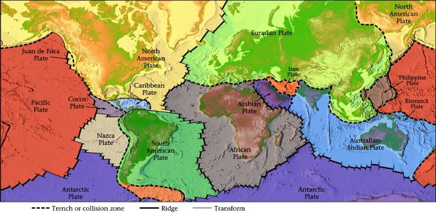 La surface de la Terre est divisée en une quinzaine de plaques tectoniques rigides qui se déplacent les unes par rapport aux autres. Les frontières entre ces plaques sont de trois natures différentes :