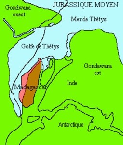 ![]() Position de Madagascar au Jurassique moyen Source : E. Gonthier et J.M. Valère |