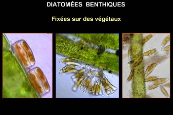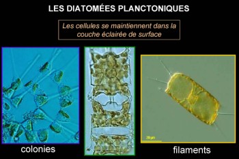 Les diatomées (Bacillariophycées) sont des algues microscopiques unicellulaires. Elles sont photosynthétiques et possèdent plusieurs chloroplastes qui leur confèrent une couleur verte ou brun doré.