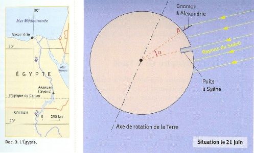 Mais c'est Eratosthène (environ 276 - 175 av. J.-C.) qui fit faire un progrès décisif à notre connaissance sur la forme de la Terre. On lui doit une carte du monde, et on lui attribue les premières mesures de la circonférence et du rayon de la Terre (sans preuves formelles il est vrai) grâce à une expérience fort ingénieuse :
