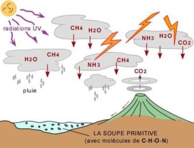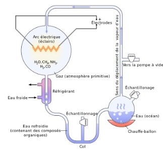 En 1953, deux Américains, Stanley Miller, biologiste (1930-2007) et Harold Urey, chimiste (1893-1981), firent une expérience célèbre qui simulait ce que l'on pensait être les conditions terrestres primitives après formation de la croûte : une atmosphère réductrice et un océan chaud. Ils ont chauffé un ballon d'eau (l'océan) qui communiquait avec un mélange de gaz (l'atmosphère = méthane, ammoniac, hydrogène, vapeur d'eau) soumis à des décharges électriques. Au bout d'une semaine d'expérience, ils ont obtenu un grand nombre de molécules organiques, en particulier 13 acides aminés présents dans les cellules.