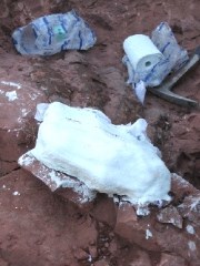 | Trois étapes pour extraire un fossile (ici un pied) : consolider, dégrossir, plâtrer et sécher | ||