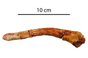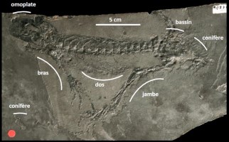 présente une grande partie du squelette (omoplate, bassin, dos, bras, jambe) sauf la tête et la queue. La pièce montre des traces de