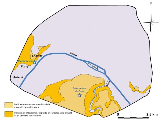 ![]() Carrières de calcaire lutétien à Paris (jaune clair : exploitations souterraines, jaune foncé : exploitations à ciel ouvert et souterraines) Source : Jean-Pierre Gély |