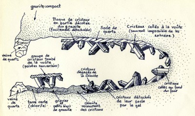 Les géodes tapissées de cristaux sont appelés localement des fours. Ces cavités naturelles, situées dans des filons de quartz ou à proximité, sont en général étroites et assez profondes. Il faut être alpiniste pour y accéder et leurs dimensions rendent la récolte des cristaux très difficile (un four de grande taille peut atteindre 5 à 6 mètres de long pour seulement quelques décimètres de large et de haut).