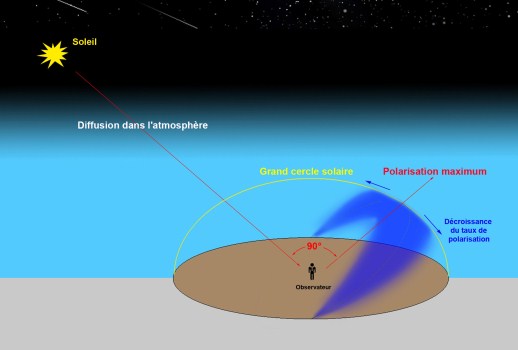 La lumière émise par le Soleil n'est ni cohérente ni polarisée. Sa diffusion dans les molécules de N2O2 de l'atmosphère génère un rayonnement privilégiant par diffusion Rayleigh les courtes longueurs d'onde du spectre visible (d'où la couleur bleue du ciel). Ce rayonnement est polarisé linéairement avec une intensité maximale sur un arc perpendiculaire au Soleil par rapport à l'observateur, et donc perpendiculaire au grand cercle solaire de l'observateur. La décroissance du taux de polarisation de part et d'autre de cet arc définit un secteur sphérique dont la largeur sur le grand cercle dépend du taux de polarisation résiduelle détectable par le polariseur utilisé.