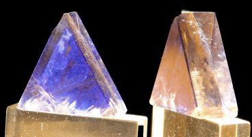 Polychroïsme de la cordiérite Deux photos d'un même cristal taillé, prises avec des orientations différentes par rapport au même éclairage incident. Musée de minéralogie de Mines Paris-Tech. Origine probable : Madagascar. |