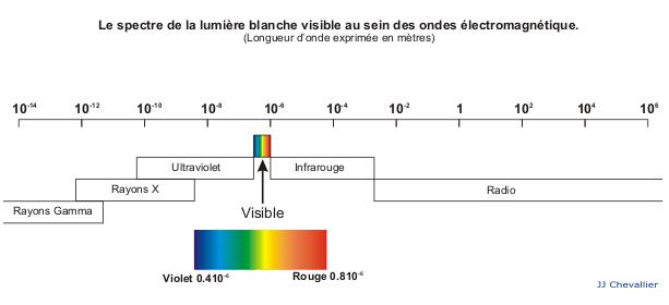 Le spectre des rayonnements électromagnétiques, c'est-à-dire la gamme des fréquences ou des longueurs d'onde possibles, est extrêmement vaste, avec des longueurs d'onde de quelques milliardièmes de microns (pour les rayons gamma) à plusieurs kilomètres (pour les ondes radio dites justement longues). Entre ces deux extrêmes, la lumière (sous-entendue comme la partie visible du spectre électromagnétique) ne représente qu'une infime partie de celui-ci avec des longueurs d'onde de 0.4 micron (pour le violet-bleu) à 0.8 micron (pour le rouge).