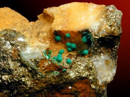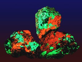 Calcite et willemite L'éclairage en lumière ultraviolette permet d'observer la fluorescence de la calcite (orange) et de la willemite (vert). Photo JFG : musée des minéraux de Crozon |