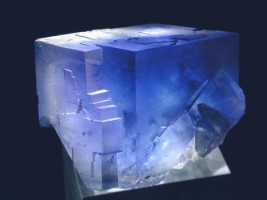 | Cette fluorite transmet le bleu Les changements de niveaux énergétiques à l'oeuvre dans son réseau cristallin excité en lumière blanche absorbent la partie rouge du spectre visible. Photo JFG : fluorite du Beix, musée ENSMP |