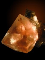 Cette fluorite transmet le jaune et le rouge Les changements de niveaux énergétiques à l'oeuvre dans son réseau cristallin excité en lumière blanche absorbent la partie bleue du spectre visible. Photo JFG : fluorite du massif du Mont-Blanc, musée des minéraux, Chamonix |