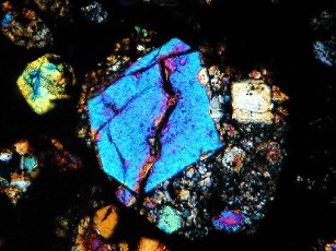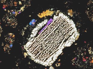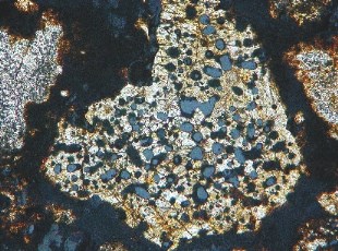 ![]() Au centre zone à cristaux parallèles d'olivine au-dessus autour (coloré brun) zone à pyroxène (G x 250) |