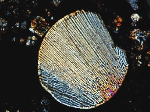 ![]() Au centre faisceau rayonnant d'olivine autour dans zone sombre, silicates et carbone (G x 250) |