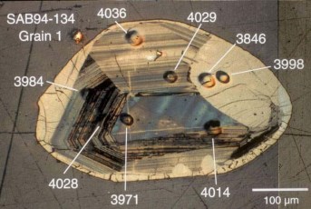 ![]() Zircon des gneiss d'Acasta, points d'analyse avec age relatif en millions d'années Source : Prof. H. Martin, Université Blaise Pascal |