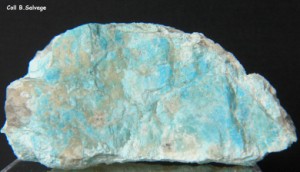 La turquoise est un phosphate hydraté de chuivre et d'aluminium CuAl6(PO4)4(OH)8 4H2O. Ce minéral, d'un très beau bleu céleste, est sensible à la chaleur, aux corps gras et à tout élément susceptible de lui faire perdre son hydratation (il ternit et devient vert). A Echassières, la turquoise se présente sous forme de nodules, souvent traversés de veines brunes de limonite et de plaquages de malachite. Comme dans la plupart des gisements, elle est trop friable pour être taillée.