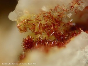 Pour compléter l'exposé, Francine Dubois-Frit, membre de la commission et passionnée de microminéralogie, présente Echassières comme un véritable paradis pour les micromonteurs. Plusieurs photos de microminéraux qu'elle y a récoltés (carminite, kidwellite, variscite, wavellite, etc.) en apportent la preuve.