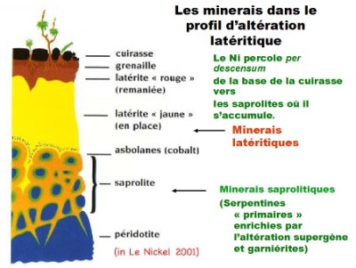 Les gisements de Nouvelle Calédonie exploitent des minerais oxydés, situés dans une nappe de péridotite qui recouvre une grande partie de l'île de Grande Terre. Ils sont le résultat d'un triple processus :