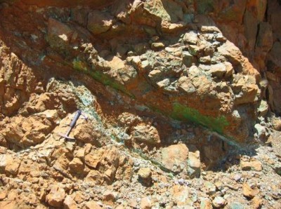 ![]() Fentes à calcédoine et garniérite dans les saprolites (Thio) |