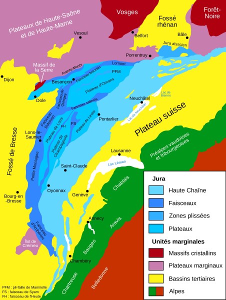 ![]() Principales unités géographiques du Jura Source : Wikimedia Commons, Juraastro |