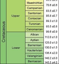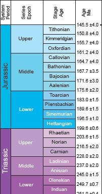 ![]() ![]() Etages du Secondaire Source : International Stratigraphic Chart |