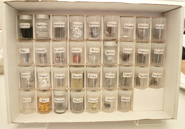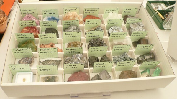 Pour concrétiser les présentations, des objets courants (une cafetière, des pièces de monnaie, une ampoule électrique, etc.) et des échantillons étaient exposés : des minerais (sidérite, bauxite, limonite, nodules polymétalliques, etc.), des minéraux (chromite, cinabre, dolomite, etc.) et des métaux (mercure, cuivre, fer, etc).