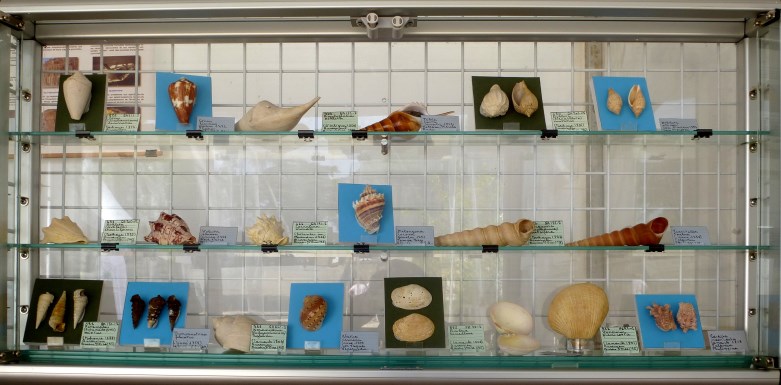 et certaines espèces actuelles. Des spécimens de grès de plage et de sable coquillier étaient également exposés.