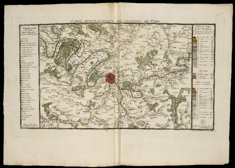 ![]() Carte minéralogique des environs de Paris Carte 40 bis in Collection complète de toutes les parties de l'Atlas minéralogique de la France, qui ont été faites jusqu'aujourd'hui (publié par Monnet, 1780) |