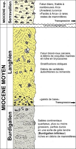 Cette mer a déposé des sédiments appelés « faluns ». Un falun est une roche sédimentaire formée de très nombreux débris de coquilles