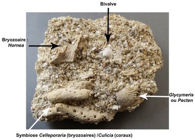 Cette roche contient également beaucoup d'autres restes d'origine biologique : bryozoaires, oursins, coraux, restes de vertébrés marins (et même terrestres), etc.