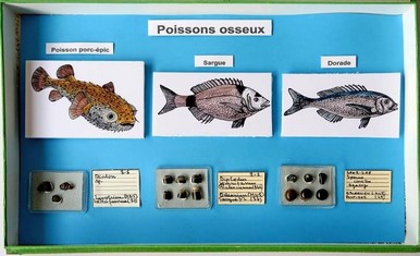 | Figure 4. Une des vitrines présentant les poissons osseux. En haut, schémas des homologues actuels. En bas, les restes fossiles trouvés dans les faluns (dents). Photo A. Cornée. | |
