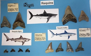 Dans l'atelier préparé pour la Fête de la Nature, seuls quelques groupes de fossiles marins ont été choisis pour illustrer la faune des faluns : poissons osseux ; poissons cartilagineux ; cétacés à dents ; mollusques et coraux.