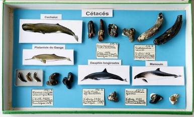 | Figure 6. Une des vitrines des cétacés. Schémas des homologues actuels et rochers et dents fossiles. Photo A. Cornée. | |