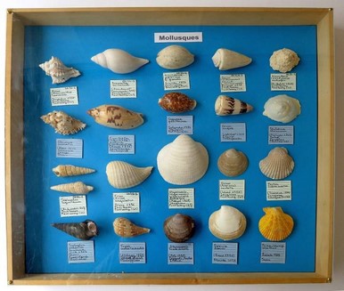 Une vitrine (figure 7) présentait en parallèle les mollusques fossiles des faluns et leurs homologues actuels. Ainsi, la comparaison entre les