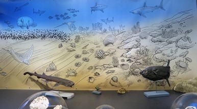 | Figure 9. Faune de la mer des faluns, au Miocène. Reconstitution présentée dans l'exposition « Faërie du Blésois » au Muséum d'Histoire naturelle de Blois, en 2022. Photo A. Cornée. | |