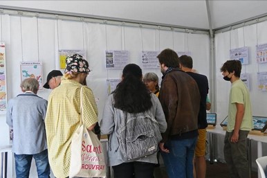 | Figure 10. À gauche, aperçu de l'atelier avec Christine Auclair qui renseigne des visiteurs. Photo A. Cornée. À droite, des enfants autour du jeu : on voit bien les deux versions proposées. Photo J.-L. Fromont. | |