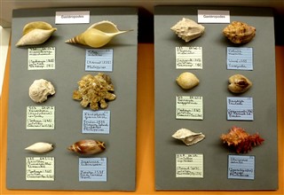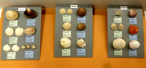 Des mollusques du Lutétien, gastéropodes et bivalves étaient exposés dans des vitrines, avec leurs homologues actuels. Des étiquettes, blanches pour les fossiles et bleues pour les actuels permettaient de faire les rapprochements. Le plus impressionnant des fossiles était incontestablement un campanile géant de 40 cm.