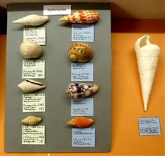 | Gastéropodes du Lutétien et actuels, à droite le campanile géant Photos Jean-Louis Fromont | ||