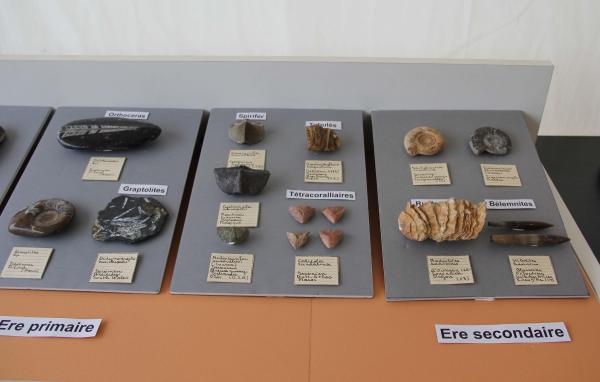 Pour illustrer le découpage du temps (sur les 540 derniers millions d'années), nous avions choisi de présenter (panneaux et échantillons) des fossiles caractéristiques appartenant à différents groupes et représentatifs des ères primaire et secondaire et du Tertiaire.