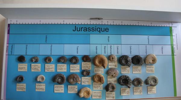 Pour notre atelier, nous avons préparé une grande vitrine présentant une ou plusieurs espèces caractéristiques des biozones de chacun des étages du Jurassique.