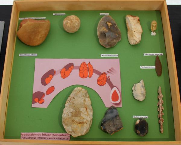 | Une première vitrine illustrait l'évolution de l'outillage depuis Homo habilis | ||