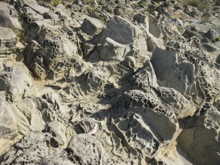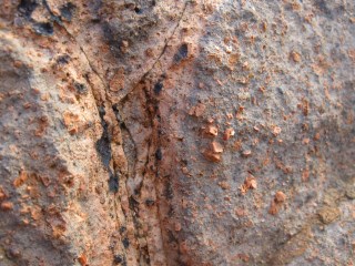 Nous découvrons ici les premiers affleurements d'estérellite. Le contact avec le grès encaissant est très net ; on observe également des taffonis produits par l'érosion éolienne en milieu marin. Une cassure fraîche de la roche permet de distinguer plusieurs minéraux caractéristiques : quartz, feldspath plagioclase, amphibole.