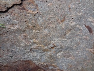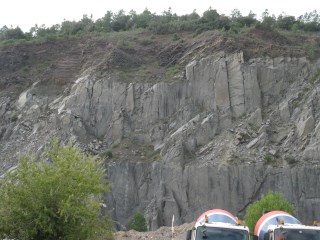 Le front de taille s'arrête au toit du laccolithe et permet de visualiser le contact avec l'encaissant (pélites du Permien). Des cassures fraîches de la roche nous montrent plusieurs minéraux intéressants : feldspaths zonés, épidote (pistachite), pyrite. A la périphérie de la carrière, on observe un niveau de roches métamorphiques de l'auréole de contact.